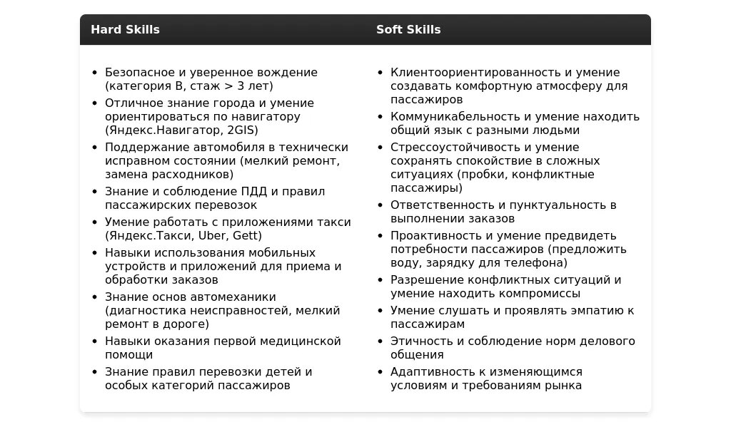 Раздел "Навыки" – это перечень ваших профессиональных навыков и личных качеств, которые полезны для работы водителем такси.