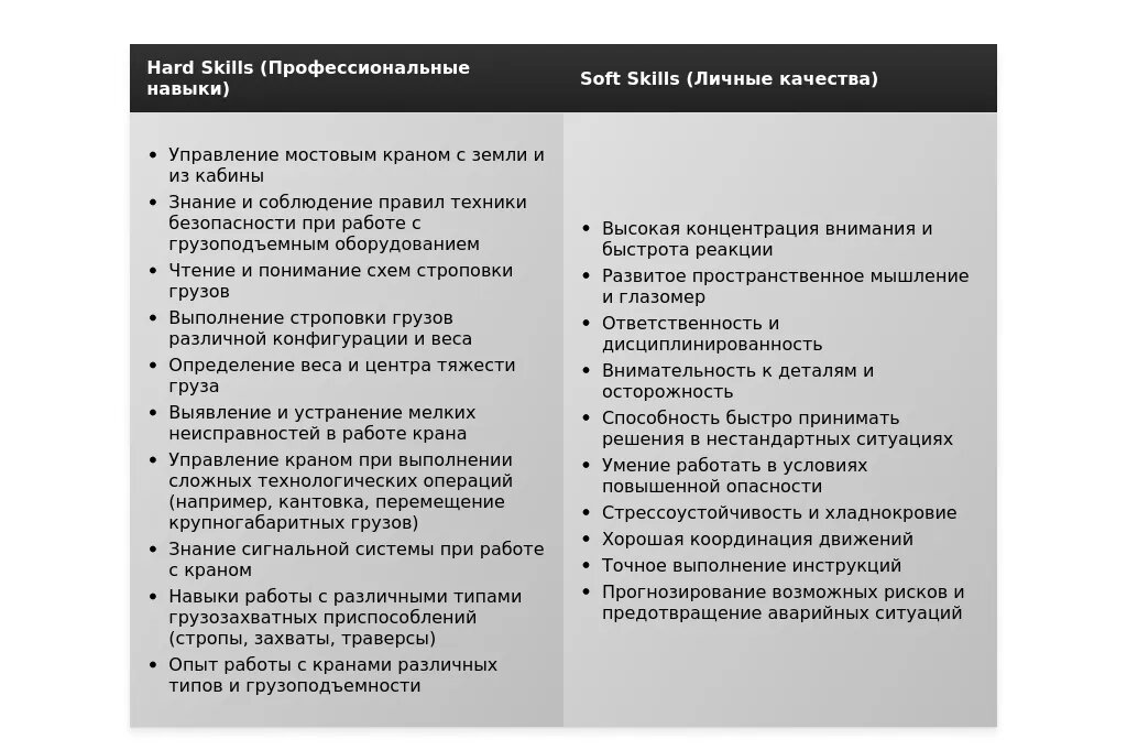 Ключевые навыки: знание правил техники безопасности, умение читать схемы, навыки обслуживания крана.