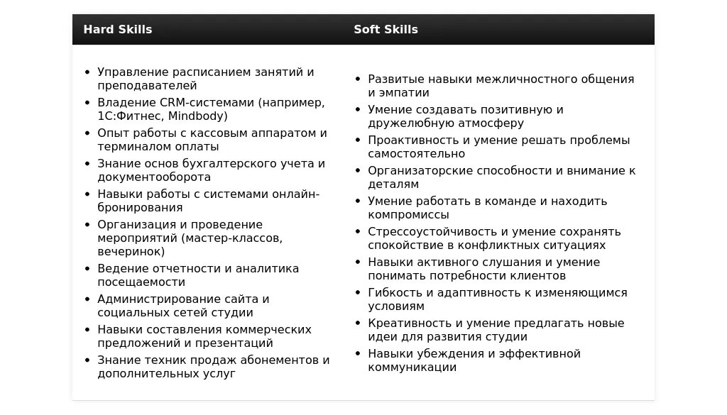 Раздел "Навыки" в резюме администратора танцевальной студии должен быть тщательно адаптирован под требования конкретной вакансии. Ваша задача – показать работодателю, что вы обладаете всеми необходимыми компетенциями для успешного выполнения работы.