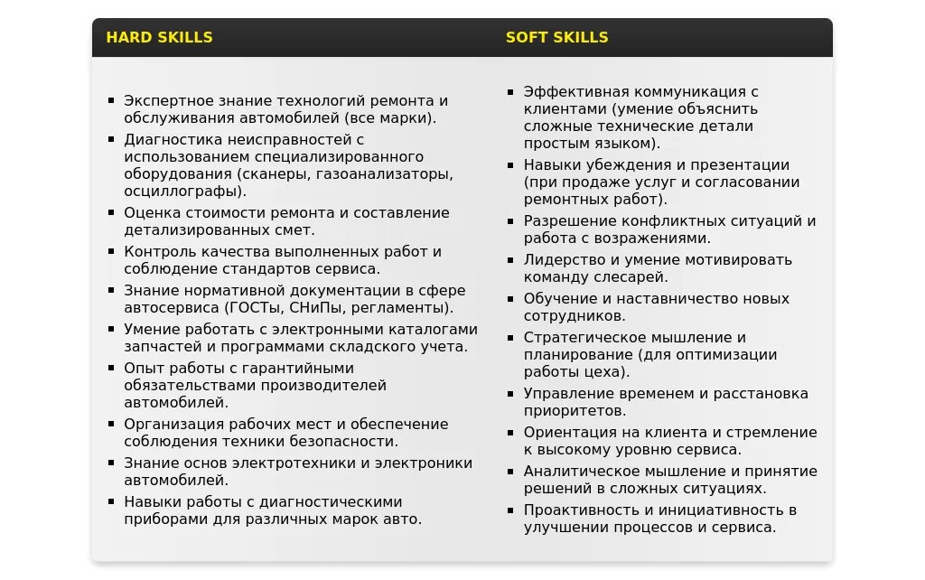 - Навыки **диагностики** и **ремонта** автомобилей