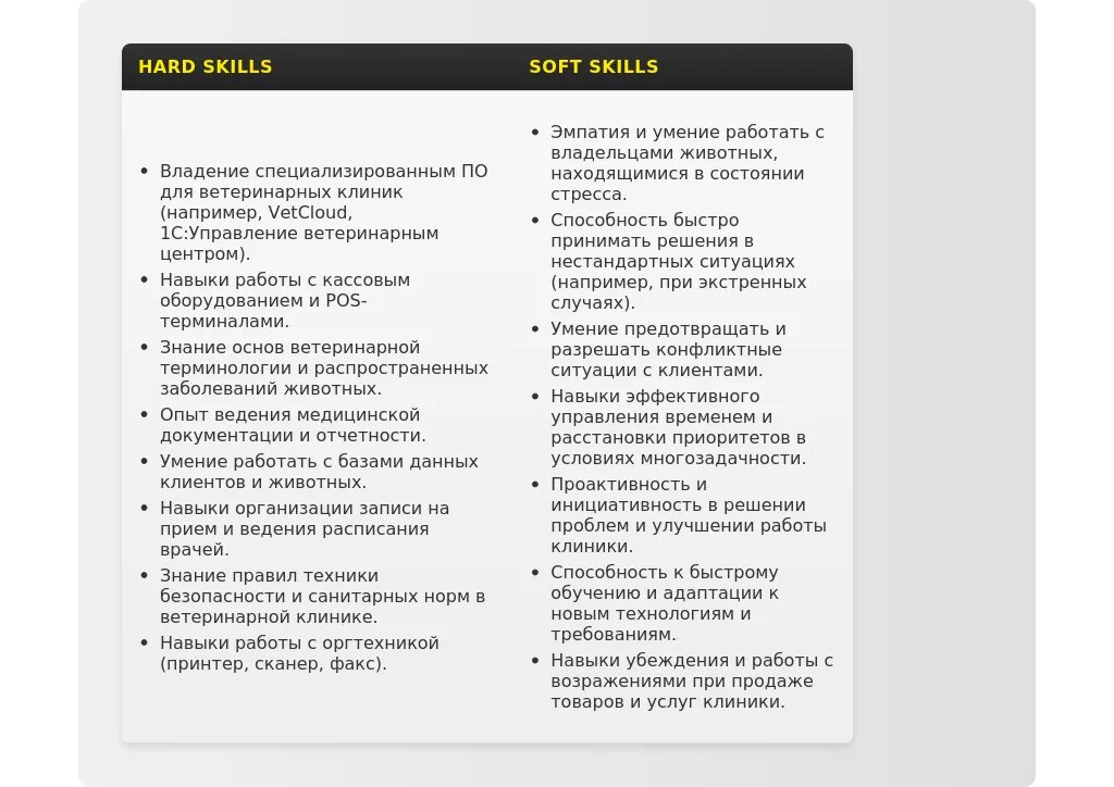 "Навыки работы с клиентами: уверенное консультирование, разрешение конфликтных ситуаций. Навыки работы с компьютером: уверенный пользователь ПК, знание программы "1С: Ветеринария", работа с кассовым аппаратом. Навыки организации работы: ведение документации, организация записи на прием."