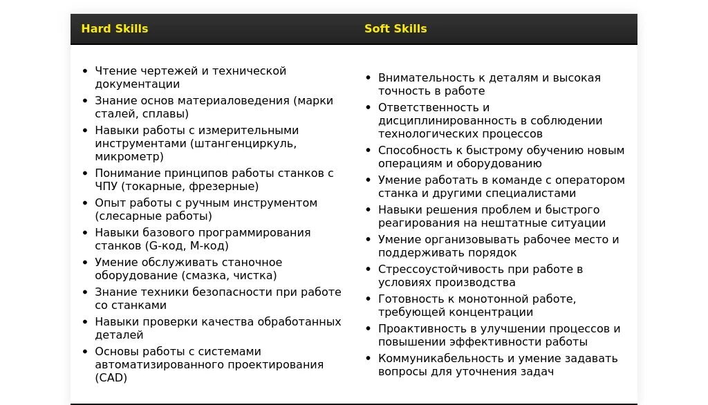 На какие качества и навыки делать акцент: Внимательность, ответственность, техническое мышление, умение читать чертежи, знание основ металлообработки, навыки работы с измерительными инструментами (штангенциркуль, микрометр).