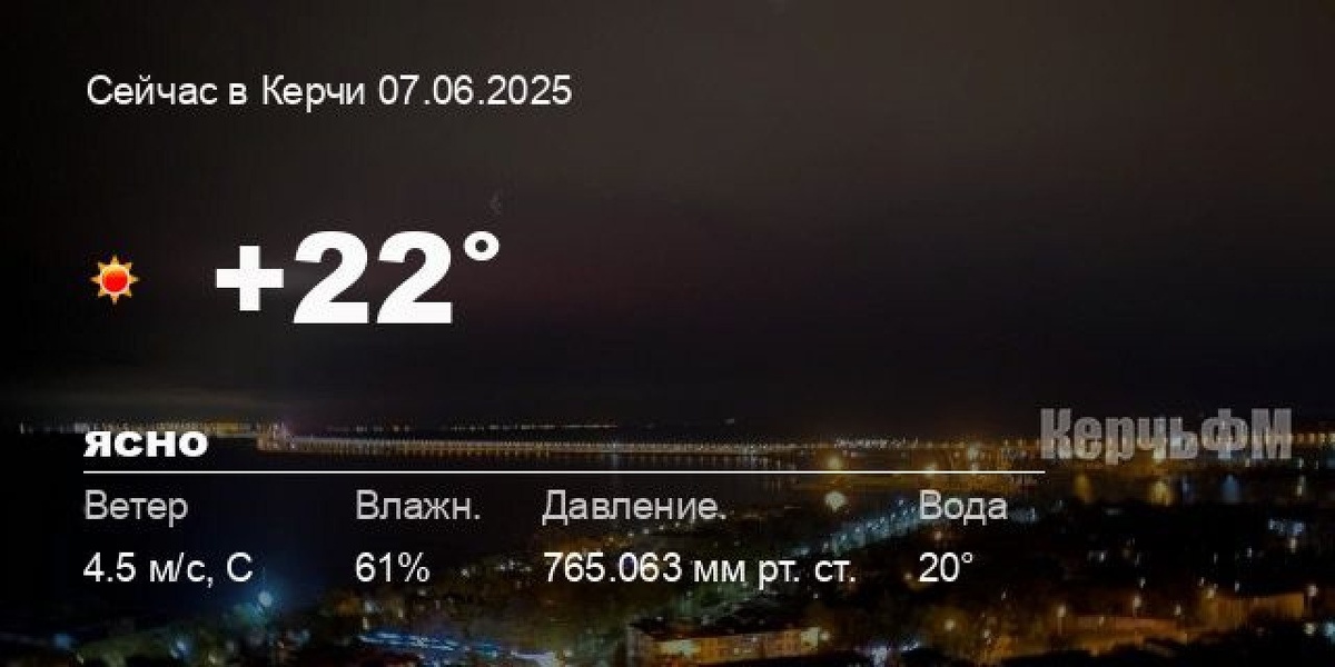 Погода в Керчи 07 июня Сегодня днем в Керчи, 07 июня, ожидается ясная погода, температура воздуха от +18.8° до +23.7°С, ветер северный 4.53 м/с, порывы до 4.82 м/с, давление 765.1 мм рт. ст., влажность 53%. Ближайшей ночью ожидается ясная погода, температура +20.9°С. Завтра, 08 июня, в течение суток ожидается ясная погода; ночью +20.9°С, днем +21.8°С, ветер северный 4.77 м/с. - Феодосия от +17.6° до +25.2°С, 🌞 ясно - Судак от +15.7° до +22.3°С, 🌞 ясно, море: 19°C - Симферополь от +14.3° до +25... подробнее Подписывайся на КерчьФМ.РФ @kerchfm