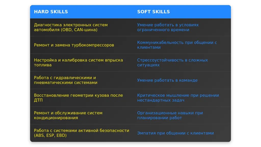 Сравните свои навыки с требованиями вакансий на текущий 2025 год. Убедитесь, что вы указали современные технологии, такие как работа с гибридными автомобилями.