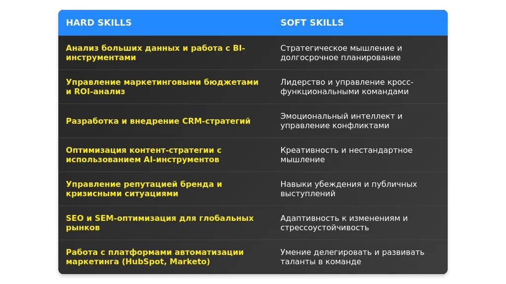 - Обязательные навыки: Маркетинговая стратегия, Управление брендом, Цифровой маркетинг, Анализ данных, Управление бюджетами.