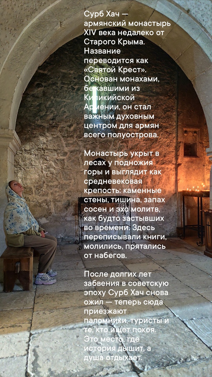 Сурб Хач — армянский монастырь XIV века недалеко от Старого Крыма. Название переводится как «Святой Крест». Основан монахами, бежавшими из Киликийской Армении, он стал важным духовным центром для армян всего полуострова. Монастырь укрыт в лесах у подножия горы и выглядит как средневековая крепость: каменные стены, тишина, запах сосен и эхо молитв, как будто застывших во времени. Здесь переписывали книги, молились, прятались от набегов. После долгих лет забвения в советскую эпоху Сурб Хач снова ожил — теперь сюда приезжают паломники, туристы и те, кто ищет покоя. Это место, где история дышит, а душа отдыхает.