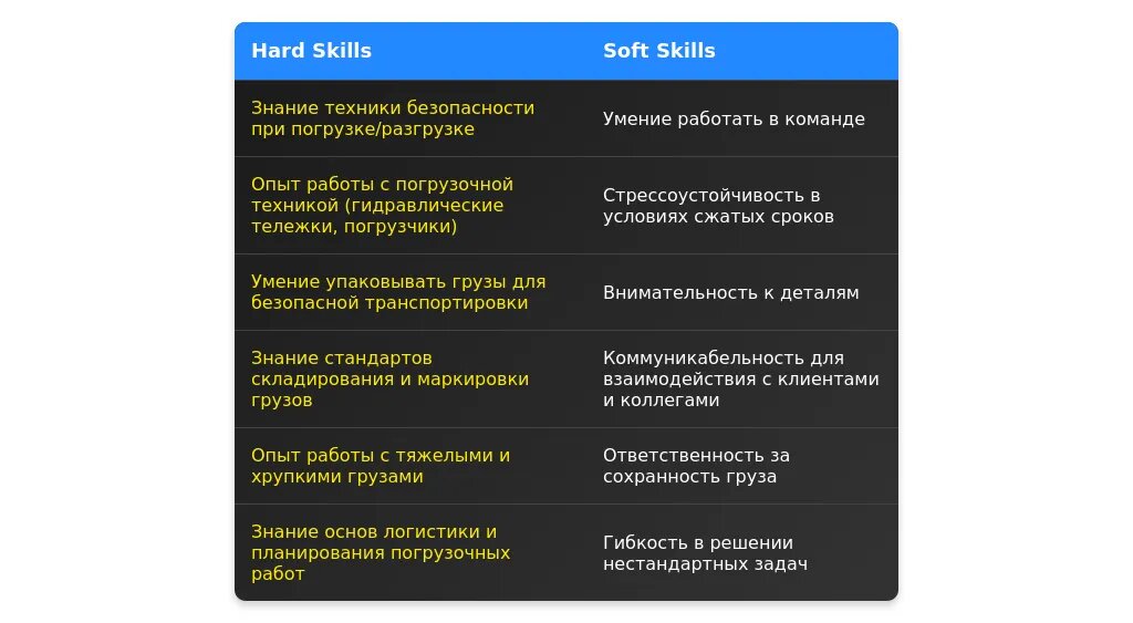 - Примеры:✅1. Физическая выносливость: готов работать с тяжелыми грузами и выполнять задачи в условиях высокой нагрузки.✅2. Обучаемость: быстро освоил базовые навыки работы с погрузчиком за 2 недели.✅3. Внимательность: тщательно проверяю маркировку грузов, чтобы избежать ошибок.