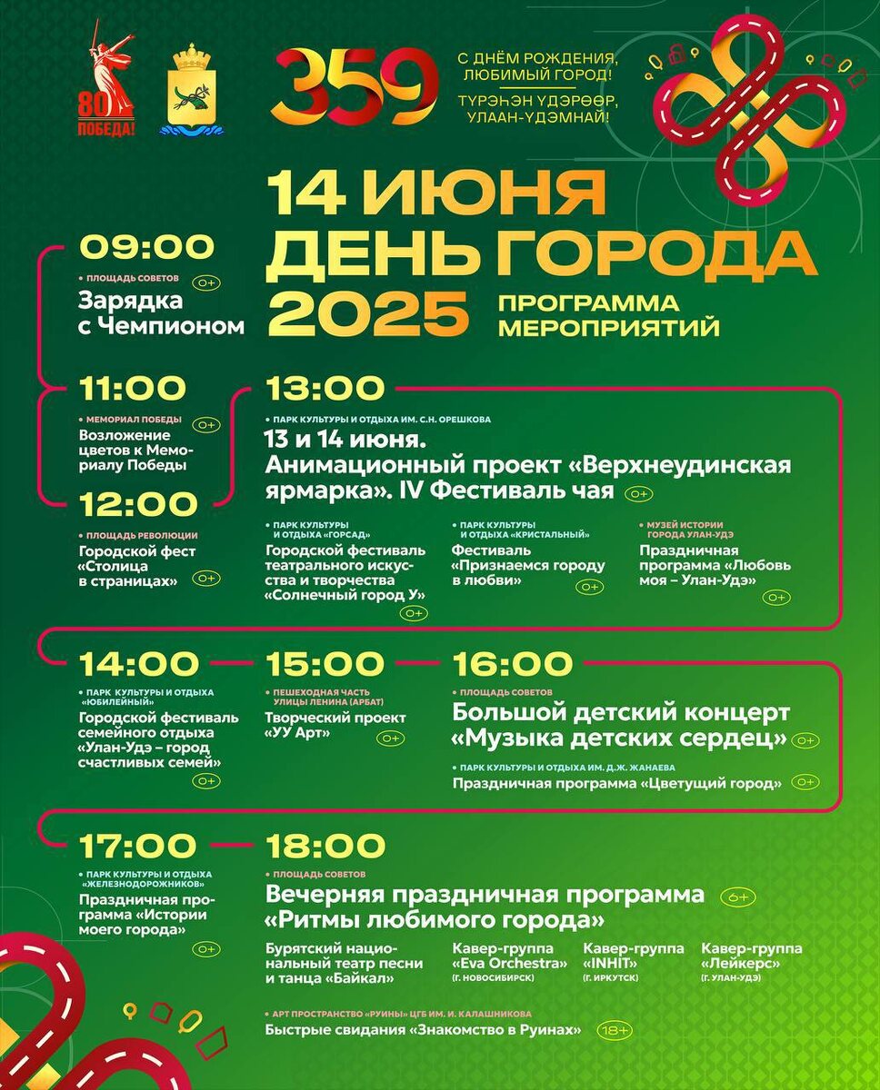 14 июня Улан-Удэ отмечает День города! Столице Бурятии исполняется 359 лет. 🎉В честь этого события жителей и гостей города ждут зарядка с чемпионом, ярмарка «Верхнеудинская», праздничный концерт и многое другое. Подобная афиша дня рождения Улан-Удэ - в карточке. 🔴Подписывайся на Тивиком 💻Проекты.Новости 📤 Поделиться бустами 📨Прислать новость @tvcomtv или в бот обратной связи @tvcomnewstv_bot