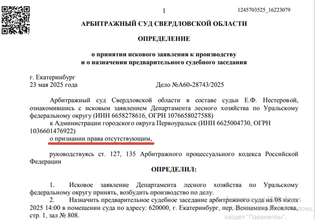 Однако мы не знали, что уже через 2 дня, 22 мая 2025 то самое Агентство при Минприроды подало в суд на администрацию Первоуральского МО с целью признания права администрации на участок отсутствующим.