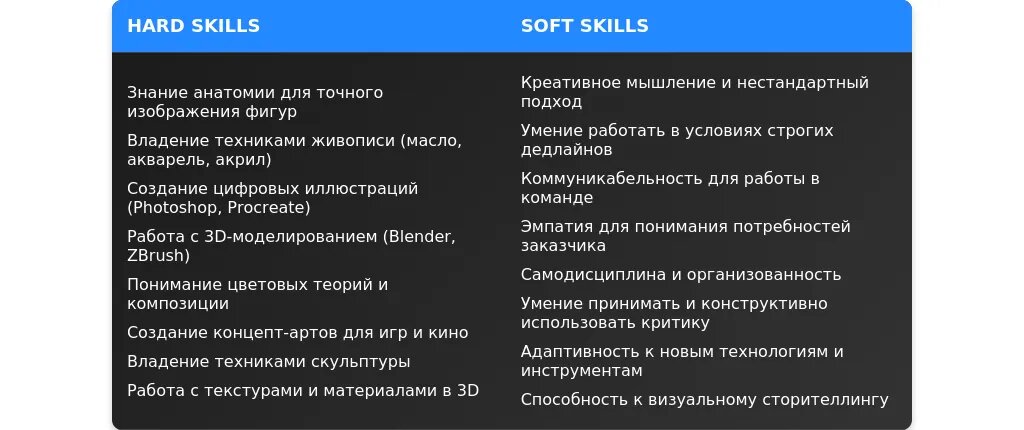 Пример 2: "Художник по концепт-арту с опытом работы в геймдеве. Участвовал в создании визуального стиля для 3+ игр, включая проекты для мобильных платформ и ПК. Владею Blender и ZBrush."