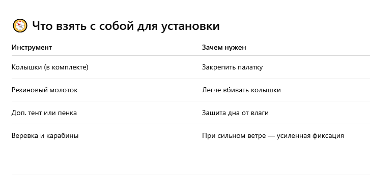 🔍 Лайфхак: Спите головой чуть выше ног — меньше отёков по утру. ⚠️ Частые ошибки при сборке палатки