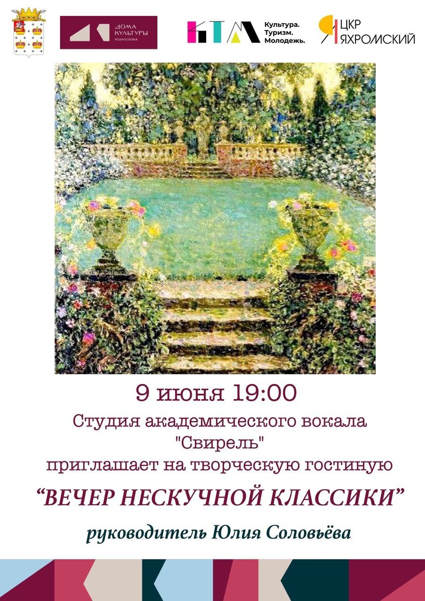 Студия академического вокала "Свирель" приглашает на творческую гостиную "Вечер нескучной классики" 🎶 В программе прозвучат произведения Г.Ф. Генделя, Дж.Каччини, А.Вивальди, П.И.Чайковского,неаполитанские и русские народные песни,а также песни и романсы советских композиторов.✍️ Не упустите возможность побывать на вечере, где будет царить классика и Ваши любимые мелодии в исполнении опытных и юных участников Студии! 📆 9 июня 🕐 19:00 ВХОД СВОБОДНЫЙ 📍ЦКР «Яхромский» ул. Заречная д.2