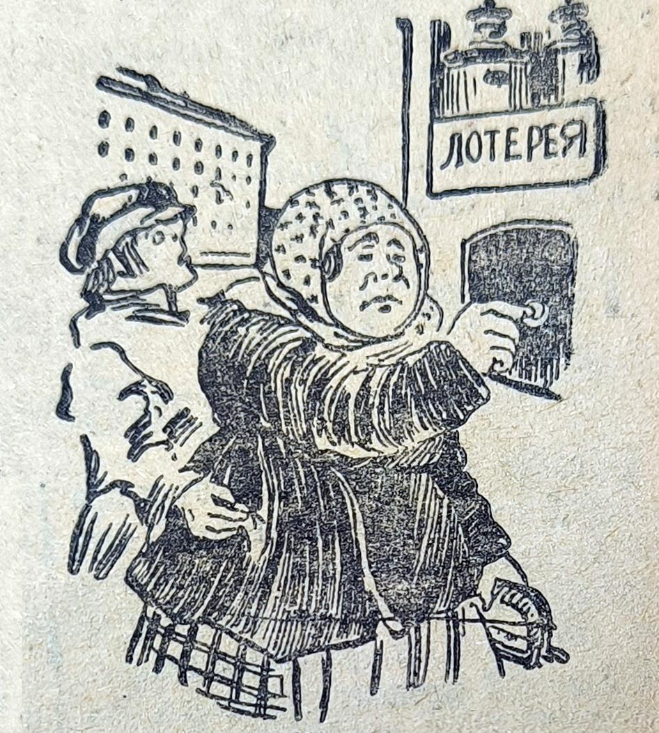 (Картинка с натуры). Ну, и народу же сегодня собралось на лотерею. Прямо толкучка какая-то. Все куда-то лезут вперед, карабкаются друг на друга. — Что тут такое, милый, — спрашивает старушка. — Эта лотерея в пользу беспризорных. — Аль не слыхала? — А… поняла, поняла, — растягивает старушка и пошла дальше. У открытого окошка полная суматоха. Одна женщина, лет под тридцать, так, особенно старательно пробивается к окошечку, наконец достигла своего. И вся растрепанная, с лица пот градом льет, она держит в руке билетик. Вдруг, хватаясь за карман, закричала. Батюшки… деньги-то, деньги-то вытащили окаянные. А, что ты тут будешь делать. — Чего ревешь-то, они ведь в пользу беспризорных тоже пошли — замечает кто-то из собравшихся. М. Бритарев. Газета «Коммунар», ежедневный орган Губкома РКП(б) и Губисполкома Советов рабочих, Крестьянский и Красноармейских депутатов Тульской губернии, № 126 (2058) от 7 июня 1925 года. * Цитируется с сохранением орфографии и пунктуации первоисточника.