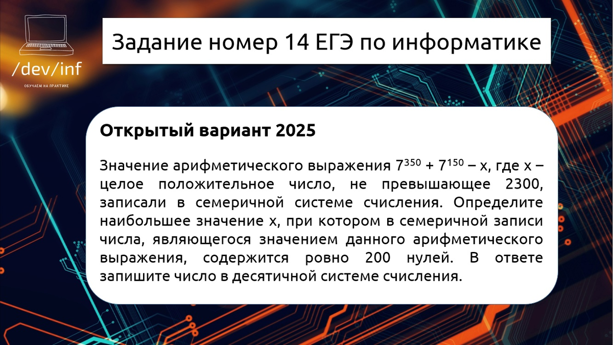 В задании номер 14 ЕГЭ необходимо получать запись числа в системе счисления с разными основаниями. Поэтому встроенной функции питона bin() уже недостаточно. Необходимо писать алгоритм перевода. Рекомендую не учить алгоритм, а писать его на основе "ручного" перевода чисел: делить число нацело пока от него не останется 0 и выписывать все остатки от деления в обратном порядке. Рассмотрим задание из открытого варианта 2025. https://openfipi.devinf.ru/task/3F4398 Необходимо посчитать количество нулей в семеричной записи.