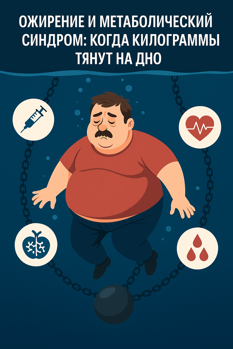 Если бы жир просто портил фигуру, это можно было бы пережить. Меньше фоток в купальнике, больше фотошопа — и живи спокойно. Но, увы, лишний вес — это не просто вопрос эстетики. Это якорь. И если его вовремя не сбросить, он утянет вас на самое дно — туда, где метаболический синдром, диабет, гипертония и прочие «радости». 🥵 Что за зверь такой — метаболический синдром? Это не одна болезнь, а целый букет. В него входят: • абдоминальное ожирение (тот самый живот, который не прячется даже под чёрной футболкой); • повышенное артериальное давление; • высокий уровень сахара в крови; • низкий уровень «хорошего» холестерина (ЛПВП); • и высокий уровень триглицеридов (жиров в крови). Если у вас есть три из этих пунктов — поздравляем, метаболический синдром у вас в кармане. А вместе с ним — повышенные риски инфарктов, инсультов, диабета 2 типа и преждевременной смерти. 🍩 Связь с ожирением? Самая прямая. Особенно если жир откладывается не просто где попало, а в районе живота. Внутренний