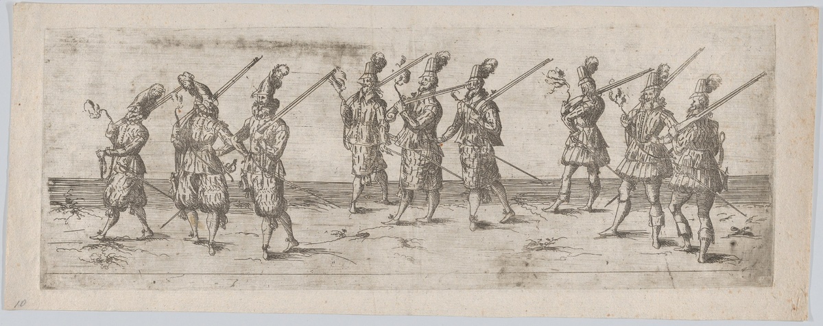 На этой гравюре, созданной анонимным мастером из Германии, три группы мужчин с оружием в руках собираются в таинственном шествии. Необычное сочетание силы и уязвимости, историческая сцена пробуждает вопросы: защищают ли они свою землю или выступают на войну? Каждое движение этих персонажей наполнено глубинным смыслом, который заставляет задуматься о мотивах и последствиях.