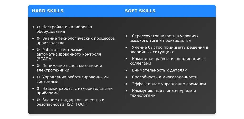 Как подтвердить наличие soft skills: Приведите примеры из опыта работы или обучения. Например: "Обеспечивал бесперебойную работу линии в условиях повышенной нагрузки, что требовало стрессоустойчивости и организованности".