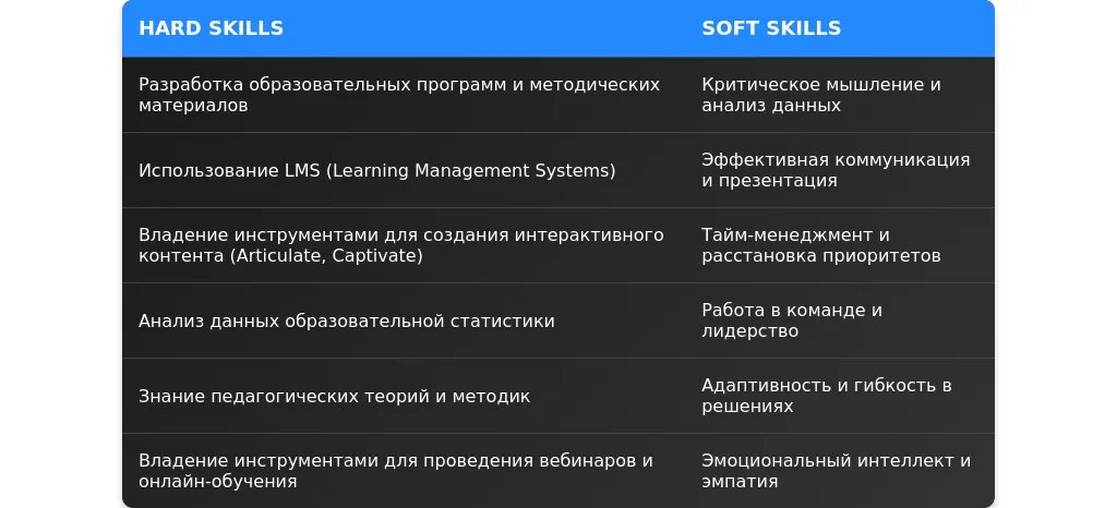 - Навыки для акцента: Базовые навыки работы с LMS, создание презентаций, умение анализировать данные.