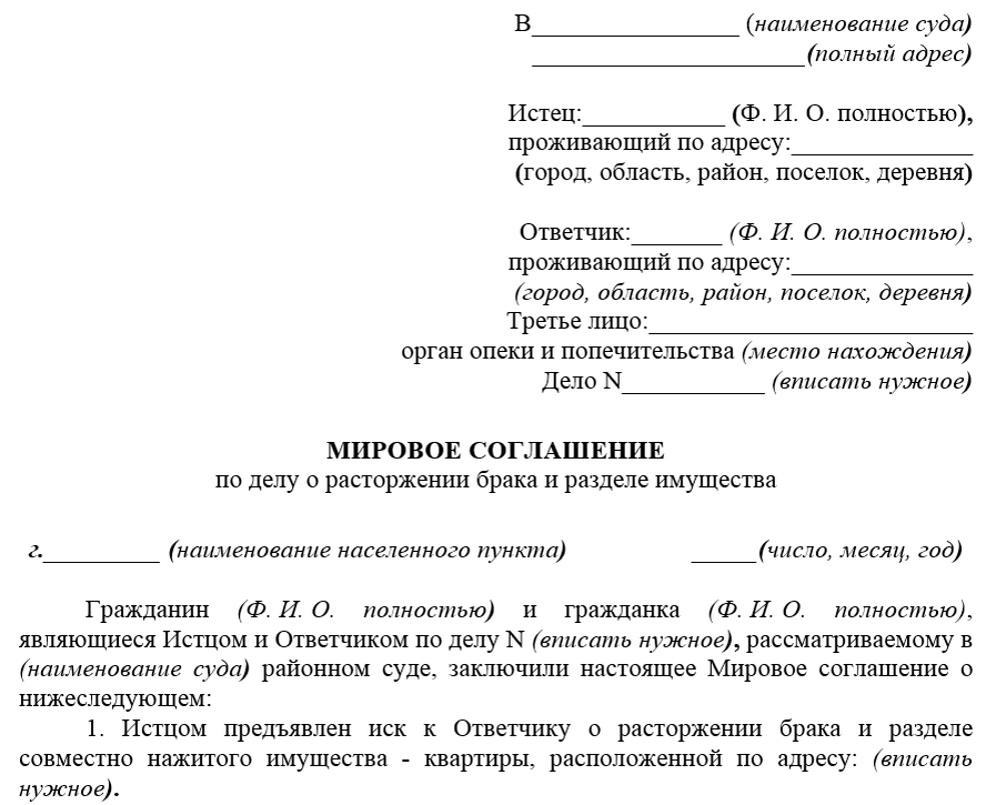 Мировое соглашение при расторжении брака о разделе кредита, ипотеки, наследства и задолженностей