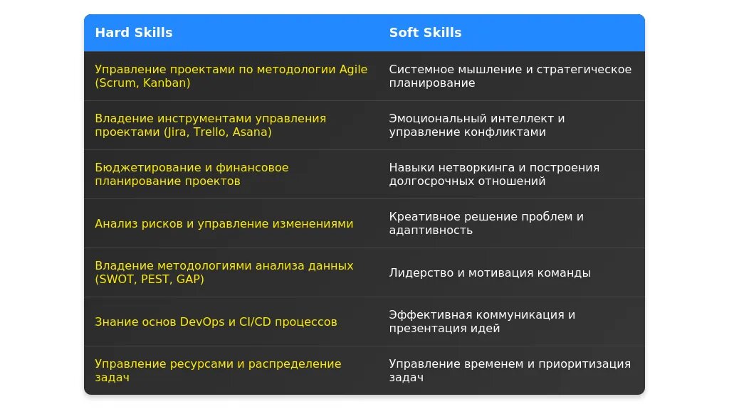 - Глубокое знание методологий: Сертификат PMP, опыт работы с Agile, Scrum, Waterfall