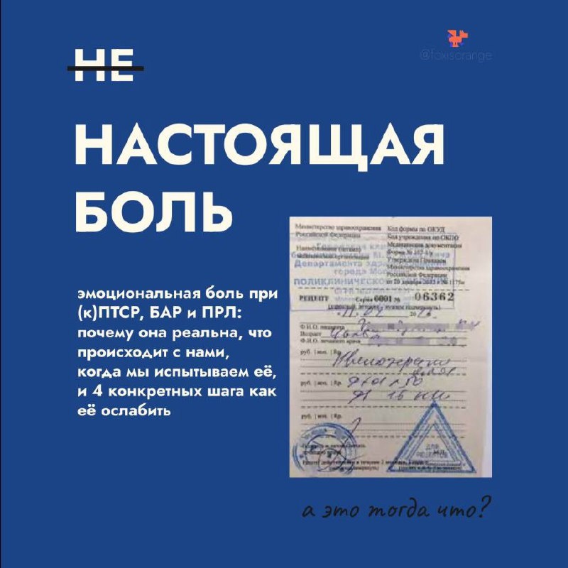 про ненастоящую боль почему человек с прл испытывает такие изнуряющие эмоции? почему он может резать себя, чтобы остановить их; почему он глушит их алкоголем? являются ли люди с БАР счастливчиками, обладателями продуктивной «мании»? почему люди с кптср такие агрессивные? почему они замораживаются и не могут жить, как другие? потому что эмоциональная боль и психические расстройства по-настоящему существуют. потому что боль в них настолько же реальна, как физическая. о том, что происходит с нами в расстройствах, почему нам так плохо и как помочь себе в тяжелые моменты — в карусели. #апельсиноваяпомощь
