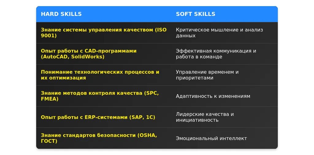 После адаптации: "Знание ISO 9001 и HACCP, опыт работы с CAD-программами, навыки управления проектами."