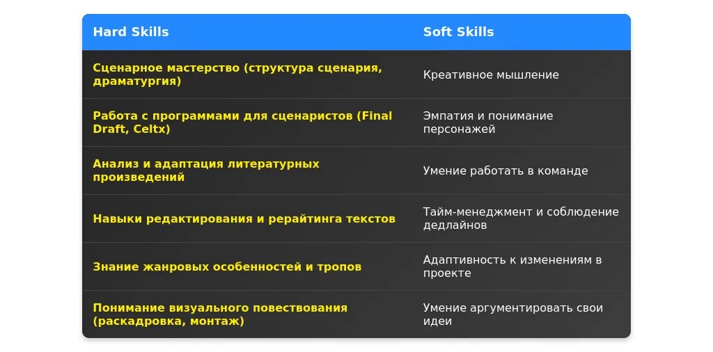 Навыки следует перегруппировать, чтобы выделить те, которые наиболее соответствуют вакансии. Укажите ключевые компетенции, такие как знание программ для написания сценариев, умение работать с жанрами или опыт участия в крупных проектах.