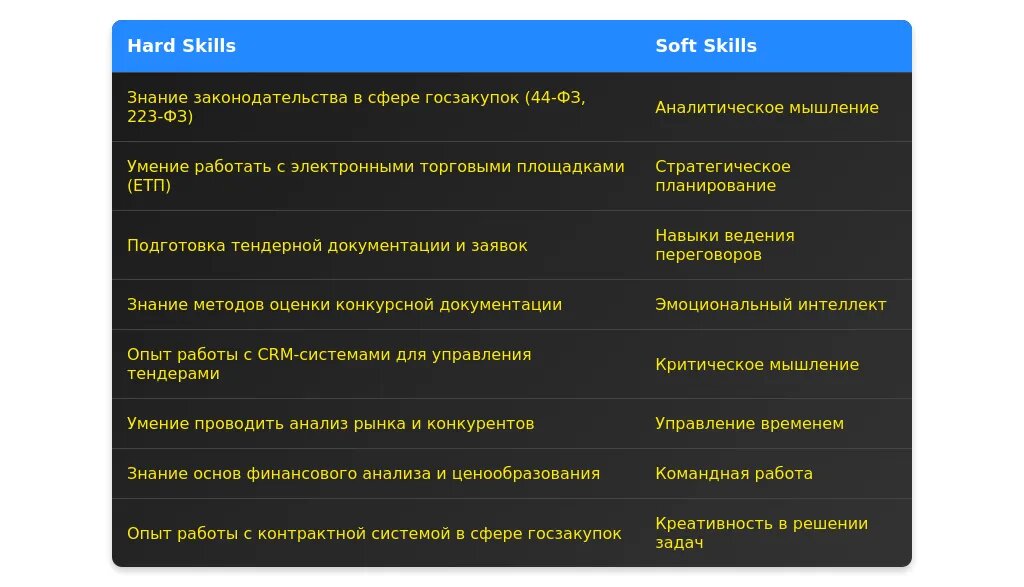 Пример 4: Требуется опыт участия в госзакупках (обязательно) и знание программного обеспечения для тендеров (желательно). Скрытое требование — навыки ведения переговоров с поставщиками.