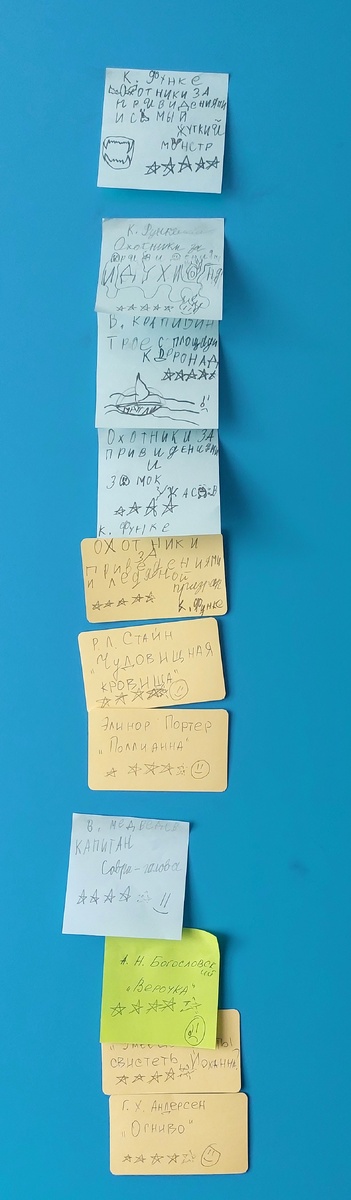 Рейтинг показался мне более взрослой штукой, и по итогу он вызвал у ребенка больший интерес. Потому что он подразумевает манипуляции с прочитанными текстами. Карточки с записанными на них прочитанными книгами перемещались по вертикальной оси, занимая то лидирующие позиции, то опускаясь в низ, уступая место новым книжным любимчикам.