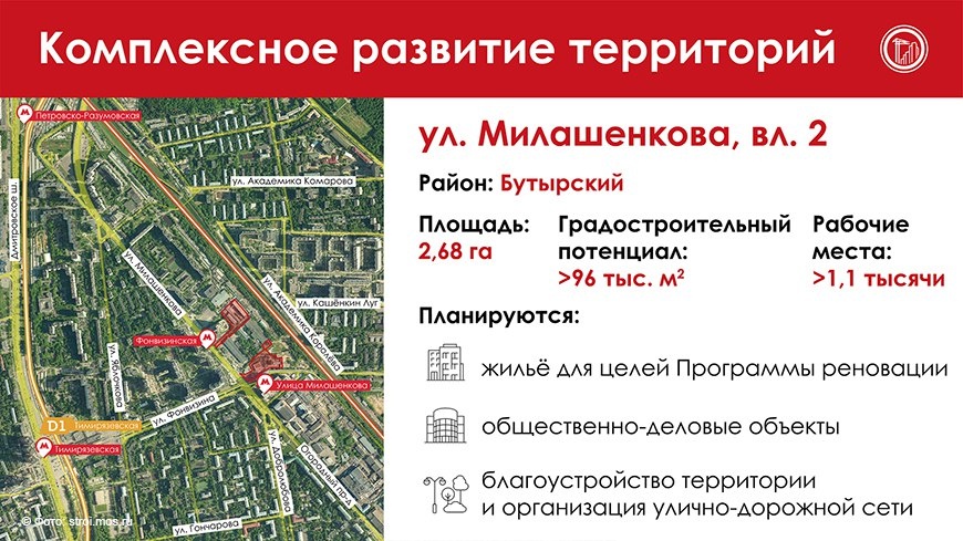 🏗️ Жилье по реновации построят в Бутырском районе в рамках КРТ В Бутырском районе СВАО Москвы, недалеко от станции метро «Фонвизинская», планируется масштабное преобразование территории. Под застройку выделены два участка на улице Милашенкова, владение 2, общей площадью 2,68 га. В настоящее время там расположены нежилые здания, которые будут демонтированы. Власти столицы, в рамках программы комплексного развития (КРТ), намерены создать современный квартал с жилыми и инфраструктурными объектами. Об этом сообщил мэр Москвы Сергей Собянин в своем Telegram-канале... смотреть подробнее >> Реновация в Москве