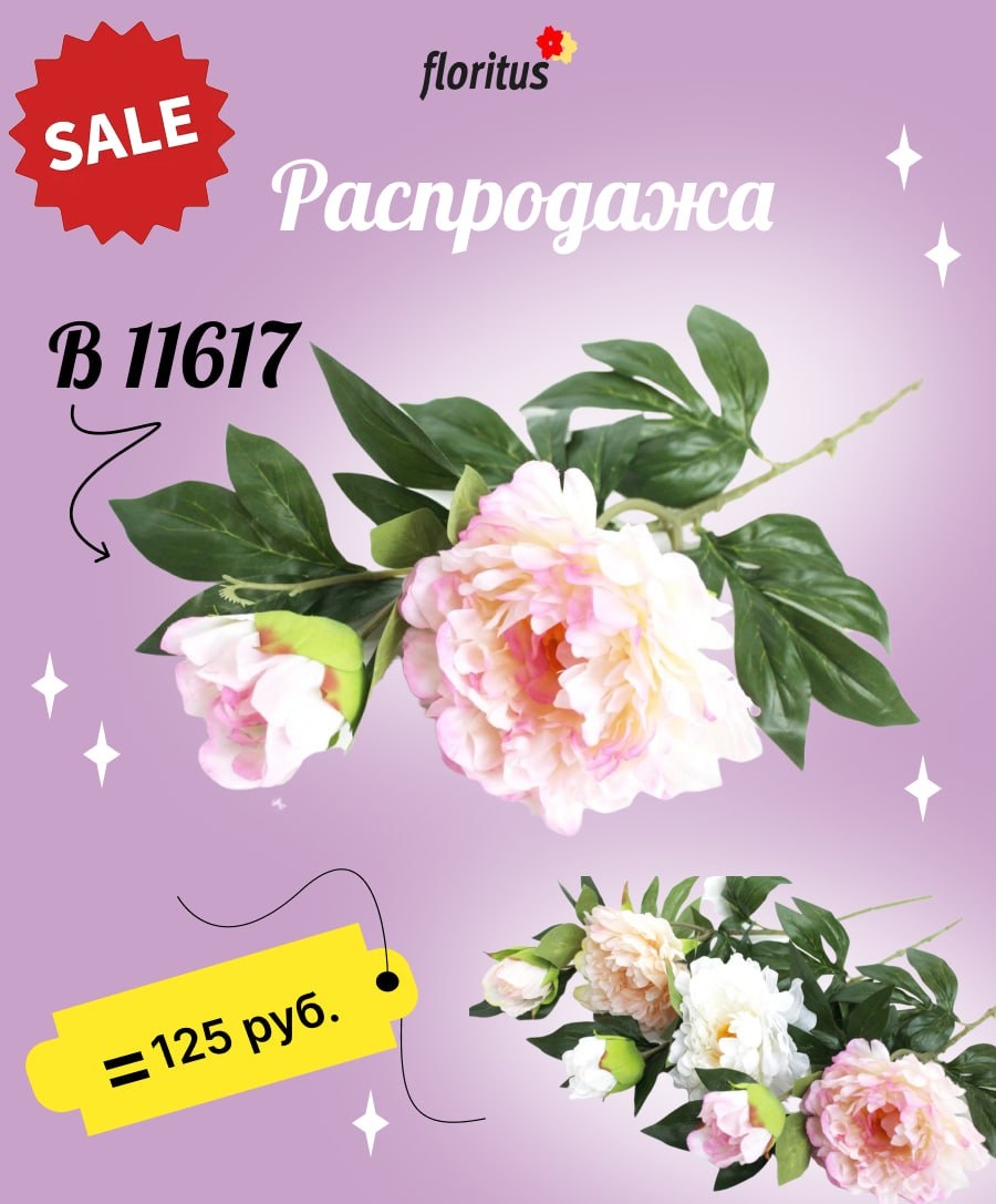 💥 Р А С П Р О Д А Ж А 💥 Дорогие друзья, на распродаже — шикарная ветка пиона, объёмная и эффектная! 🔹 В11617 — Ветка очень большого пиона «Биг Бен» ✔️ 2 головы, высота 70 см ✔️ Цвета: белый, персиковый, розовый 💰 Всего 125 руб. за ветку! Цветы крупные, отлично смотрятся в напольных вазах и больших композициях. 🌸Сделать заказ можно на нашем сайте или по телефону📞 🛍А также приглашаем вас в наш магазин в Москве.
