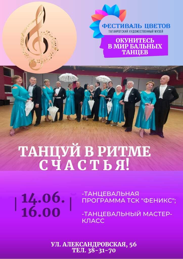 Фестиваль цветов, который состоится в Таганрогском художественном музее 14 июня, подарит гостям много удивительных встреч — театральных, музыкальных, танцевальных. Главное июньское событие, наполненное цветочными ароматами и увлекательными историями, поэзией и музыкой, приурочено к празднованию Дня России. Одна из предстоящих встреч будет с уникальным коллективом бального танца ТСК «Феникс» под руководством Т.И. Рожковой. Танцевально-спортивным клубом подготовлена яркая разнообразная программа в исполнении как молодежных, так и сеньорских пар. Посетители получат незабываемые впечатления от искрометных и лиричных номеров, а также смогут принять участие в мастер-классе от мэтров танцевального искусства. Гостей ждут в 16.00 по адресу: ул. Александровская, 56. Телефон: 8(8634) 38-31-70. Также во время фестиваля цветов запланированы пешеходные экскурсии по исторической части Таганрога «Здесь всякая улица к морю стремится» и «Вам от Чехова цветы!», тематическая экскурсия «Вальс цветов» по о
