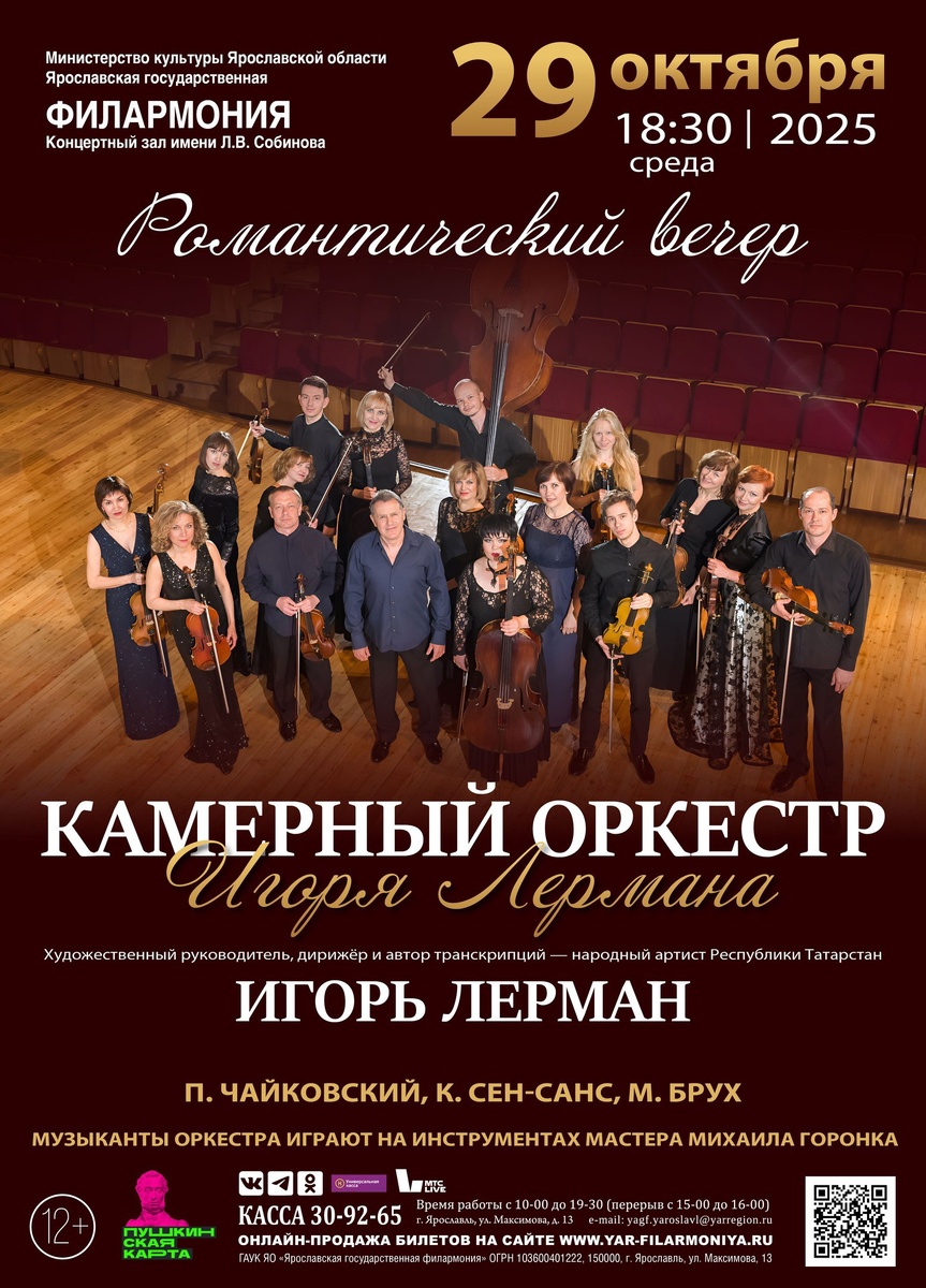 29 октября 2025 г. в 18:30 час. приглашаем на концерт одного из ведущих музыкальных коллективов России - Камерного оркестра Игоря Лермана (Республика Татарстан). ✨ Основатель, художественный руководитель и дирижер камерного оркестра - народный артист Республики Татарстан Игорь Лерман. 👏👏👏 🎶 В программе вечера прозвучат сочинения П. Чайковского, К. Сен-Санса, М. Бруха. https://clck.ru/3MVmYf