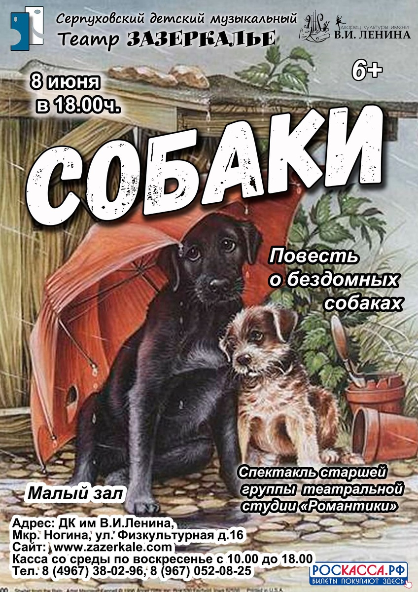 ✨Спектакль Собаки от театра Зазеркалье Спектакль останется в сердцах каждого, кто его увидит. История о стае бродячих собак, о их жизни, отношениях между собой и с людьми, которые оказываются жестокими врагами, для этих беззащитных созданий. 🚫 Возраст: 6+ 📆 08.06.2025 🕒 18:00 🏢 Серпуховский детский музыкальный театр "Зазеркалье" 📍 г. Серпухов, мкр-н Ногина, ул. Физкультурная, 16 в ДК им. В. И. Ленина 💰 Цена: 300 ₽ 🎫 Купить билет: https://zazerkale.com/ ⭐Разместить публикацию ⭐Поддержать канал голосом ✅ Мероприятия Серпухов https://dzen.ru/id/66f01c6eb4c6fe60c9ca1608 http://vk.com/serpukhov_events http://dzen.ru/serpukhov_events
