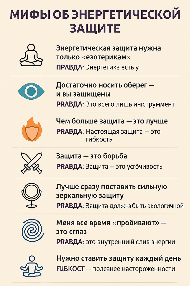 С каждым годом всё больше людей интересуются энергетической защитой. Это радует — растёт осознанность и стремление к балансу. Но вместе с этим появляется и множество мифов, страхов и ложных представлений, которые вводят в заблуждение, создают напряжение и даже вредят. Эта статья — навигатор по самым распространённым мифам, мешающим создать по-настоящему эффективную, спокойную и зрелую защиту. Правда: энергетика есть у всех. Каждый человек — это поле, которое может быть устойчивым или уязвимым. Энергетическая защита — это естественная забота о себе, не больше и не меньше. Это не про «магические ритуалы», а про границы, осознанность, ресурс и здоровье. Правда: оберег — это всего лишь инструмент. Он работает, когда вы: Если при этом вы не спите, едите на бегу, живёте в тревоге и раздражении — никакой камень не спасёт. Правда: избыточная защита превращается в энергетическую броню, которая: Настоящая защита — это гибкость. Она может усиливаться в моменты угрозы и расслабляться, когда всё