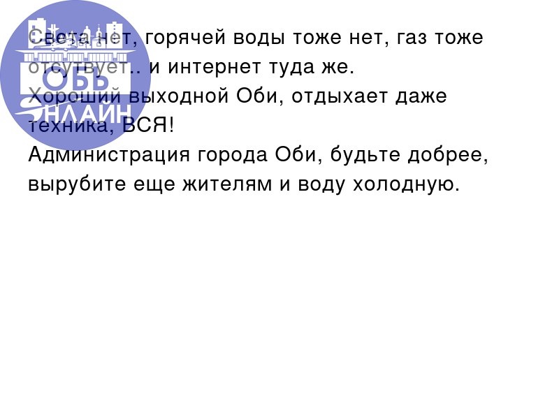↗ Света нет, горячей воды тоже нет, газ тоже отсутвует.. и интернет туда же. Хороший выходной Оби, отдыхает даже техника, ВСЯ! Администрация города Оби, будьте добрее, вырубите еще жителям и воду холодную. vk.com Подробнее на https://vk.com/ob.gorod #городобь #городобьонлайн #толмачево