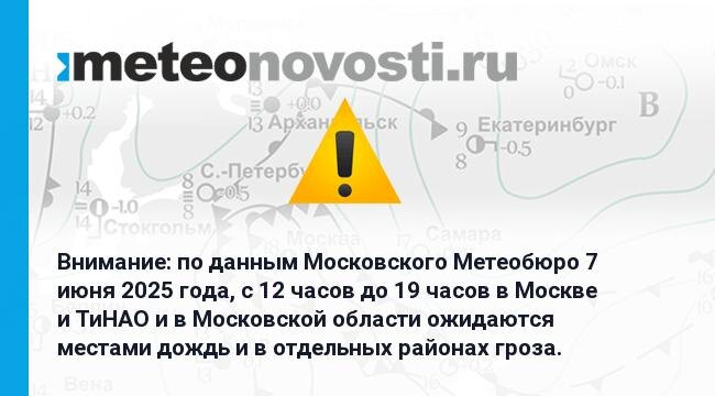 Внимание: по данным Московского Метеобюро 7 июня 2025 года, с 12 часов до 19 часов в Москве и ТиНАО и в Московской области ожидаются местами дождь и в отдельных районах гроза. Перейти на сайт Прогноз погоды на 14 дней