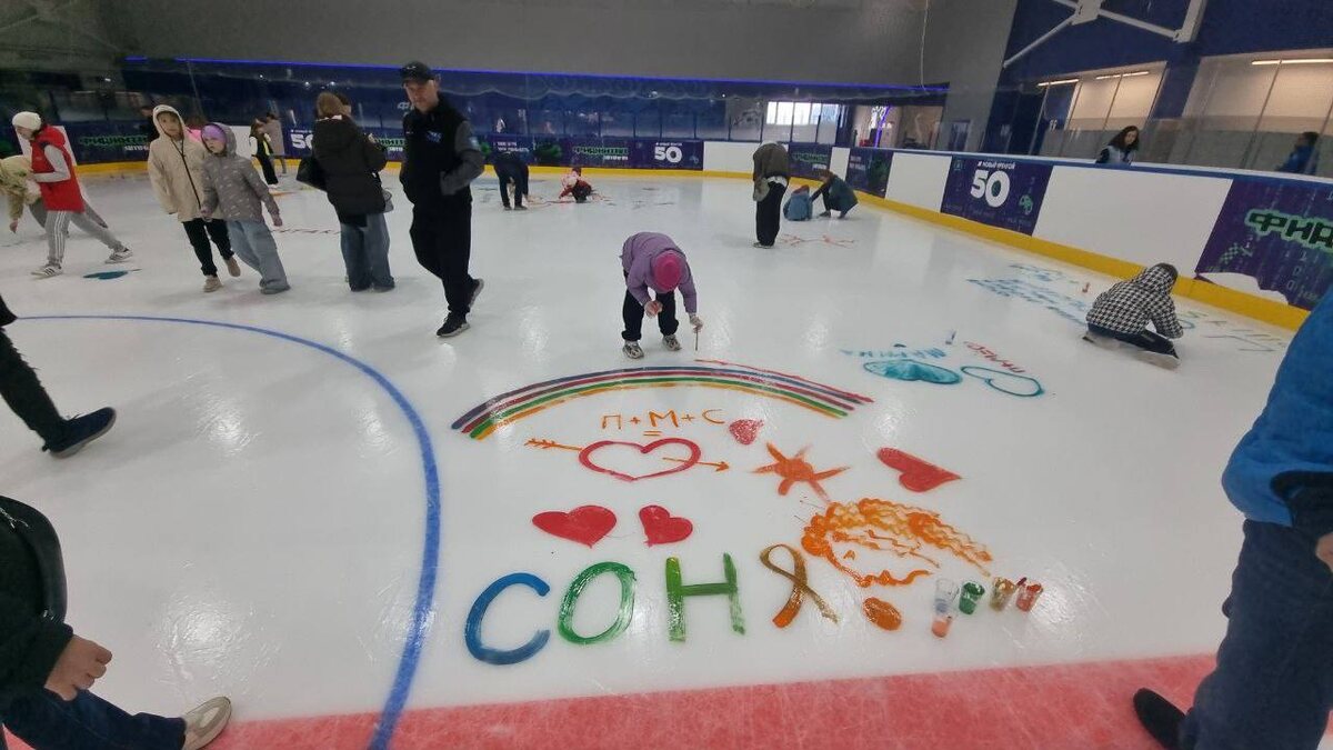 В «Льдинке» прошло весьма необычное закрытие сезона. Спортсмены, родители и все желающие дали волю фантазии, раскрасив лёд яркими рисунками и добрыми пожеланиями.