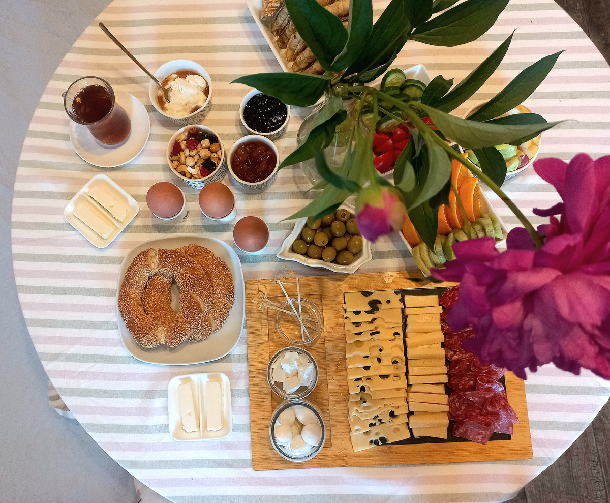 Выглядит сложнее, чем делается - буквально за полчаса вы накроете красивый и вкусный стол, который зарядит хорошим настроением на весь день. При кажущемся обилии еды тут нет ничего сложного или времязатратного. Попробуйте! У турков принято проводить за такой трапезой не меньше двух часов, и множество разных тарелочек со всякими закусками, выпечка и чай для этих неспешных посиделок - то, что надо. Среди недели у нас редко есть столько времени - и чтобы расставлять все на столе, и чтобы болтать с семьёй часами, но в воскресенье это может стать хорошей традицией. Рассказываю, как организовать дома турецкий завтрак. Много тарелочек разного объёма, но в похожем стиле. Они не должны быть плоскими, кроме той, куда вы выложите нарезку сыра и мяса и хлеб. По сути здесь нет ничего, что именно "готовится". Просто нужно закупить по списку необходимое. Я беру отдельно то, что мы любим, а не готовые смеси. Тут Вы берите то, что предпочитают в вашей семье. Тут лучше не увлекаться. Мне кажется удачн