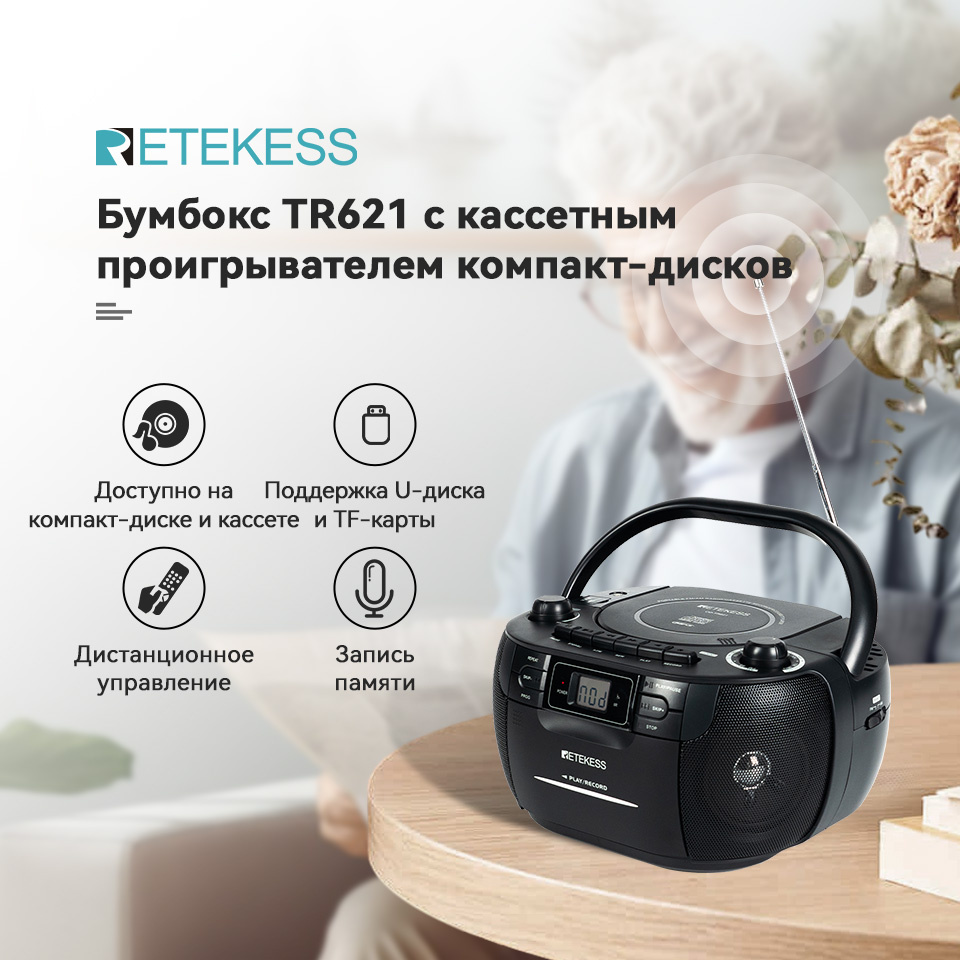 Хороший подарок; Современный внешний вид; Простая эксплуатационная функция; Воспроизведение музыки через USB/TF; Эта колонка с CD-плеером станет хорошим подарком. TR621 - это портативный комбинированный проигрыватель компакт-дисков и кассет нового дизайна, стереосистема с функцией записи и радио AMFM. Два режима для выбора любимой станции. Лента радиоподдержки, вы можете воспроизводить музыку с лент При воспроизведении музыки с компакт-диска проигрыватель компакт-дисков воспроизводит стереозвук. Пульт дистанционного управления может управлять воспроизведением компакт-дисков и USB, но не может управлять воспроизведением кассет и радио. Радио поддерживает вход U-диска и TF-карты; когда вы слушаете музыку, проигрыватель компакт-дисков воспроизводит стереозвук Показывает номер воспроизводимого трека, свободен выбор порядка воспроизведения. Батареи можно использовать на открытом воздухе, а шнуры питания — в помещении. Запишите компакт-диск, радио или внешний голос на пленку; сохраните любим