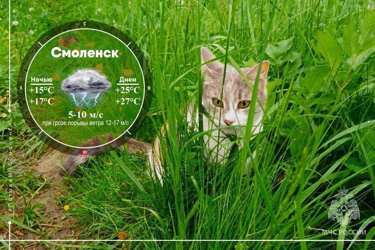☀⚡Жару разбавят дожди и грозы В воскресенье в регионе ожидается переменная облачность. Пройдут кратковременные дожди, местами прогремят грозы. Ветер подует южных направлений, его скорость будет составлять 5-10 м/с, при грозе порывы могут достигать 12-17 м/с. Будьте осторожны! Атмосферное давление 739 мм рт. столба, будет слабо падать. 🌡Температура воздуха: - по области: +12°C …+17°C, днем +23°C…+28°C; - в Смоленске: ночью +15°C … +17°C, днем +25°C…+27°C. ❗Во время грозы и сильного ветра избегай водоёмов, высоких зданий, крупных деревьев, металлических конструкций. Укройся внутри помещения или автомобиля. Обо всех изменениях в погоде смотри на сайте @ГУ МЧС России по Смоленской области #МЧСРоссии #Погода