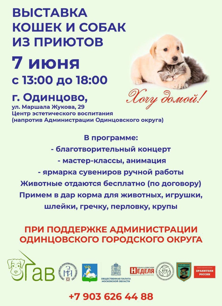Напоминаем, что сегодня с 13:00 до 18:00 в центре Одинцово пройдёт выставка кошек и собак из приютов. Понравившееся животное можно будет забрать бесплатно по договору ответственного содержания (при себе нужно иметь паспорт). Кроме того, посетители выставки смогут помочь приютам, принеся в дар корма для животных, игрушки, шлейки, гречку, перловку, крупы. В программе мероприятия благотворительный концерт, мастер-классы, анимация и ярмарка сувениров ручной работы. Выставка пройдёт в Центре эстетического воспитания: Одинцово, улица Маршала Жукова, 29 (за зданием администрации Одинцовского округа). @gb1gb2 По всем вопросам t.me/y1428