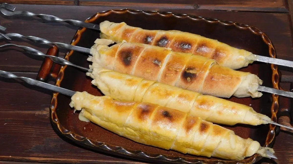 Выложить шампуры на угли, после жарки шашлыков, когда вы уже думаете, что у вас все уже прогорело, но мангал горячий. Это самое время жарить наши хачапури. Большого жара не нужно!