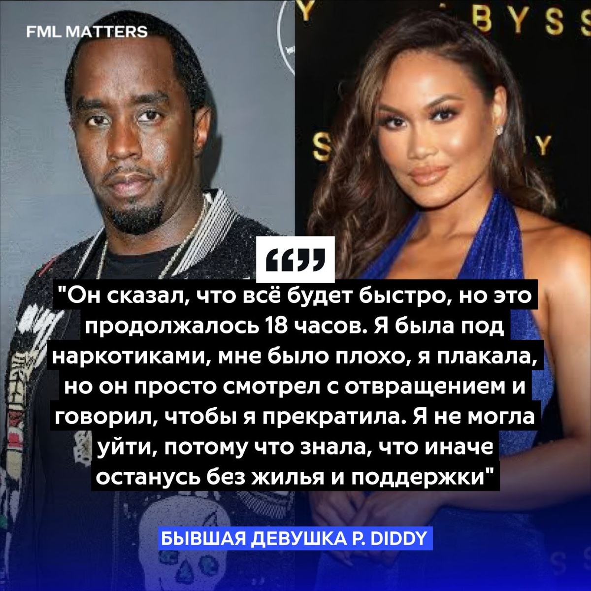 В ответ на пост ‼️ «ОН ЗАСТАВЛЯЛ МЕНЯ ЗАНИМАТЬСЯ СЕКСОМ 18 ЧАСОВ», — БЫВШАЯ P. DIDDY! По словам Джейн, с 2021 по 2024 год она регулярно участвовала в организованных Дидди «hotel nights» — многочасовых секс-вечеринках с мужскими эскортами, под действием наркотиков которые ей предоставлял Комбс. Он контролировал всё: количество мужчин, продолжительность встреч, возможность ухода и даже вопрос использования защиты — Джейн утверждает, что Дидди был недоволен, когда она просила использовать презервативы, и всегда настаивал на собственных правилах. Джейн рассказала, что Дидди требовал, чтобы эскорт-мужчины заканчивали на её тело, после чего он сразу занимался с ней сексом, не давая ей привести себя в порядок. Кроме того, он просил присылать ему фотографии пенисов эскортов, а также проявлял интерес к их размерам и внешнему виду 💀 FML MATTERS