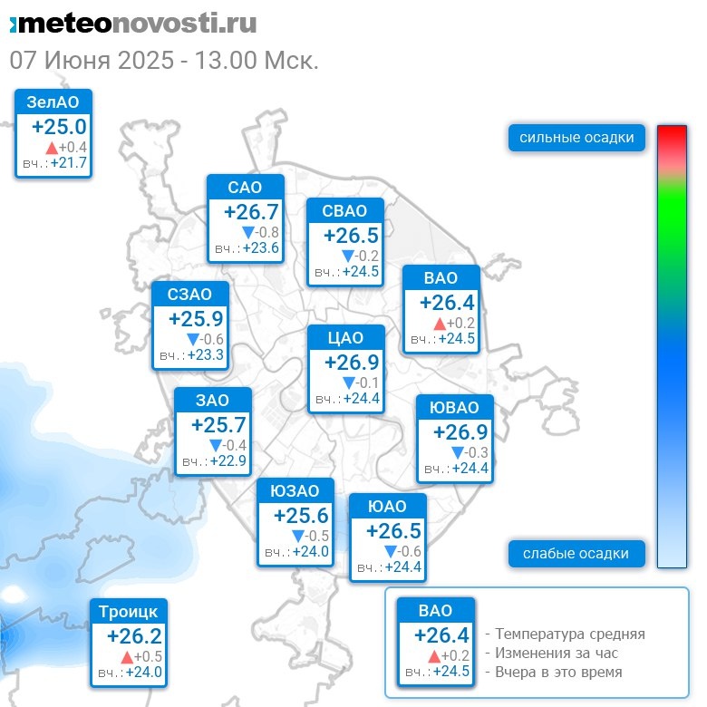 В 13:00 в Москве было от +24.3°C до +27.8°C, средняя температура +26.3°C #погода #Москва #лето #температура #7июня #суббота