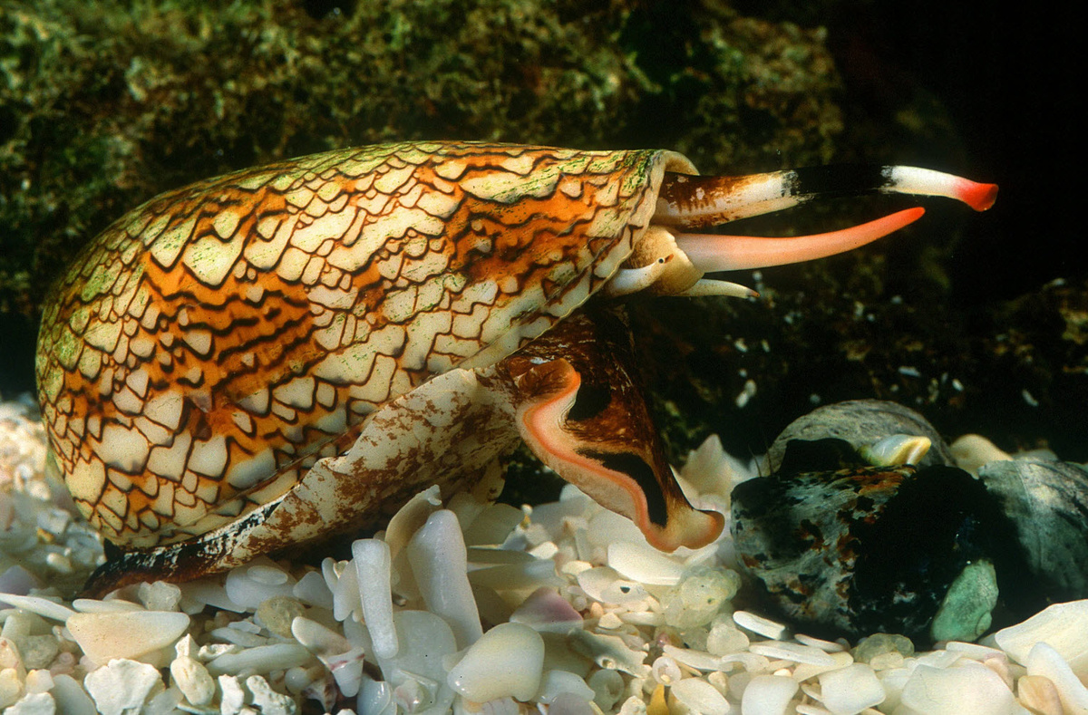 Конусный моллюск — это ядовитый хищник, который охотится с помощью специального гарпуноподобного зуба. Этот зуб моллюск выстреливает, как гарпун, в добычу, впрыскивая нейротоксин. Его яд поражает нервную систему жертвы, парализуя её почти мгновенно.