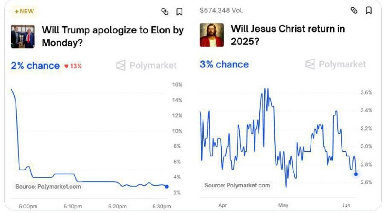 На платформах ставок интересная ситуация: шанс возвращения Иисуса на землю выше, чем шанс извинений Трампа перед Илоном к понедельнику