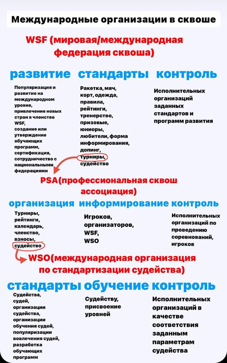Три ключевые международные организации в мире сквоша. Всемирная федерация сквоша (WSF) — главный руководящий орган этого вида спорта на международном уровне. Основанная в 1967 году (изначально как Международная федерация сквоша), WSF объединяет более 150 национальных федераций по всему миру. Отвечает за установление официальных правил игры, разработку стандартов для кортов и оборудования, а также проведение чемпионатов мира. Федерация также занимается развитием спорта в новых регионах, координирует международный календарь соревнований и утверждает программы обучения для тренеров и судей. Профессиональная ассоциация сквоша (PSA) - представляет интересы профессиональных игроков и управляет мировым профессиональным туром. Основанная в 1975 году, организация изначально представляла только мужчин-профессионалов (для женщин была WISPA), но в 2015 году объединилась с женской ассоциацией, став единой организацией для всех профессиональных игроков. PSA проводит около 200 турниров ежегодно, в