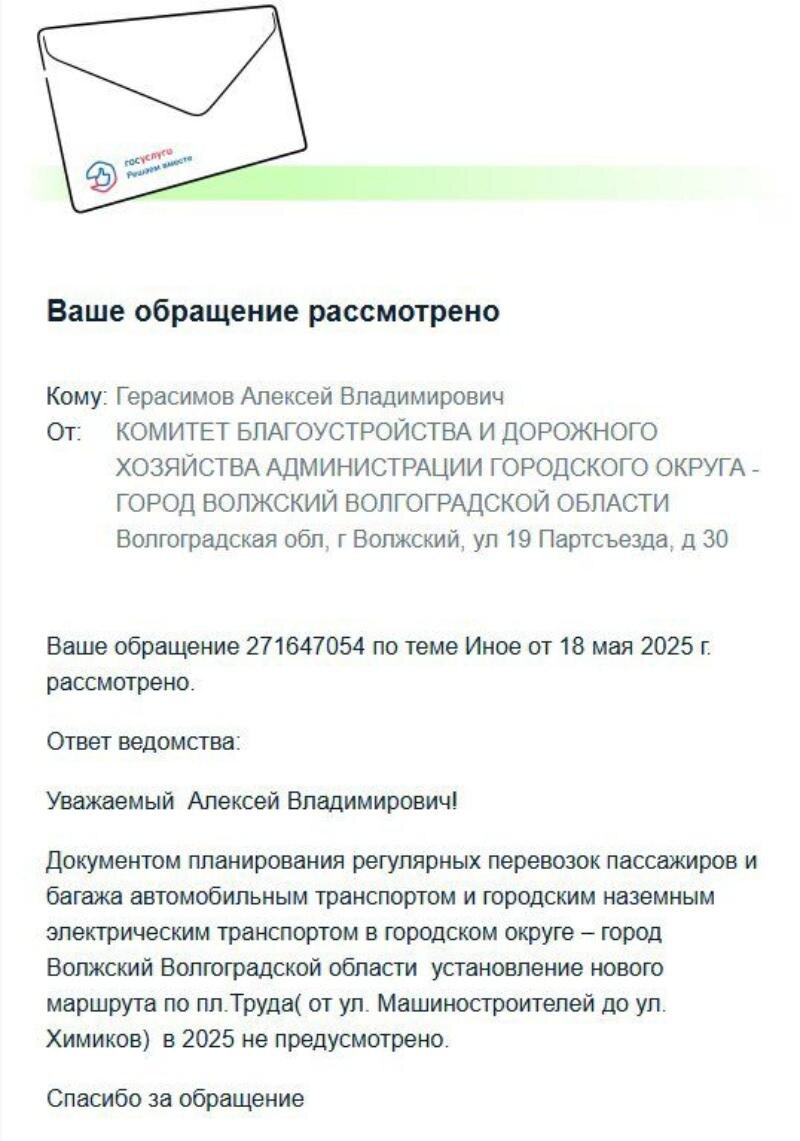 Как выяснилось в ходе прямой линии с главой города по вопросу активиста группы "Мне не все равно! Волжский" новая детская поликлиника, несмотря на свою важность, не будет обеспечена общественным транспортом в 2025 году. Ответ на прямой вопрос жительницы города, обеспокоенной транспортной доступностью, был однозначным: “Документом планирования регулярных перевозок пассажиров и багажа автомобильным транспортом и городским наземным электрическим транспортом в городском округе - город Волжский Волгоградской области установление нового маршрута по пл. Труда (от ул. Машиностроителей до ул. Химиков) в 2025 не предусмотрено.” Фото: Мне не все равно! Волжский Этот ответ вызывает недоумение и разочарование. Получается, что соврем