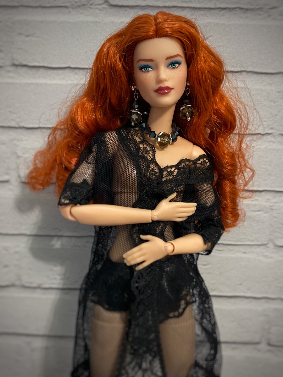 … у меня тут осталось немного фотографий украшений, созданных уже достаточно давно, но пока не вышедших, так сказать, «в люди». Кукольные истории мне забили голову, поэтому от украшений я слегка отвлеклась. Но надо бы уже завершить эту тему, я считаю. Сегодня у нас на повестке дня сет украшений под названием «Бархат». Демонстрирует наша огненная красотка Изольда, потому что на ней подходящий по смыслу комплект белья сидит лучше, чем на всех остальных. Сет состоит из колье под горло и пары сережек. Мне очень понравилось сочетание сверкающего черного и приглушенного дымчатого. Изделие, как мне кажется, прекрасно подойдет утонченной куклодаме с хорошим вкусом. Комплект будет отлично дополнять как вечерний туалет, так и такой вот образ «около ню» и даже, наверное, просто «ню». Честно, я не знаю, от чего Изольда балдеет больше - от процесса съемки, от украшений, которые она демонстрирует или же от себя самой 😁 Но модель она, бесспорно, идеальная. Одна из лучших на сегодняшний де